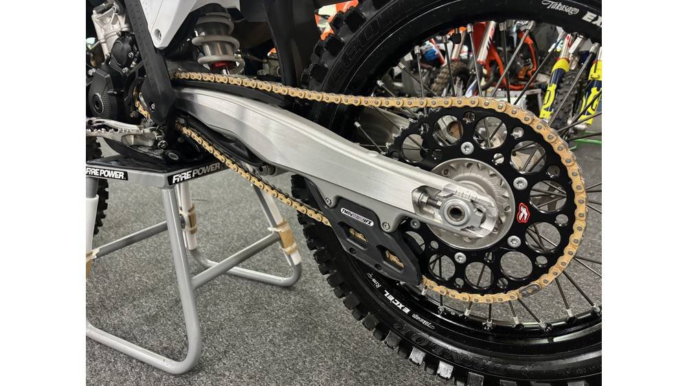 - Ground Clearance: The all-new frame and shock absorber geometry on the 2023 KTM 350 SX-F improve ground clearance of the linkage, with all-new topology optimized die-cast footpegs that are less susceptible to hooking on deep ruts, and take-offs when scrubbing.